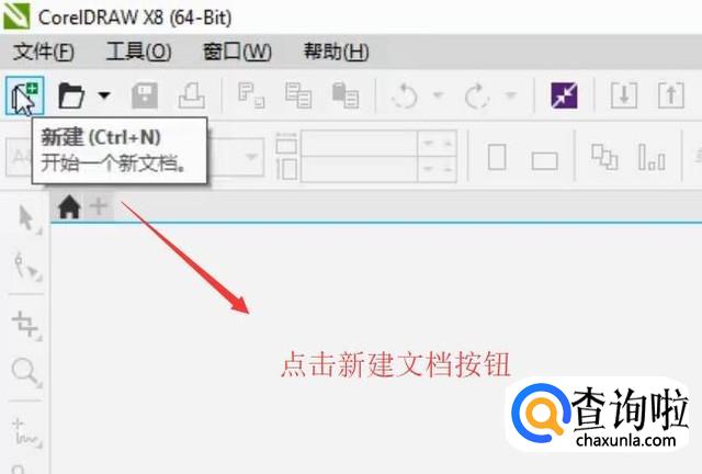打开CorelDRAW X8软件,点击左上角的新建文档按钮,如下图所示