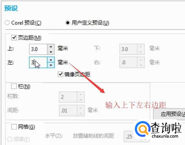 然后在右侧我们选择用户自定义预设选项,接着输入页面的上下左右边距,如下图所示