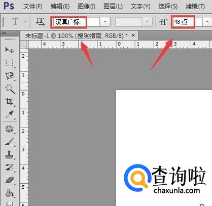 选择文字工具在上面的属性里设置字体大小和字体,如图所示: