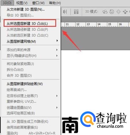 选择刚刚输入的文字然后在菜单里找到3D选项,点击该选项在其下拉菜单那里找到从所选图层创建3D凸出选项,如图所示: