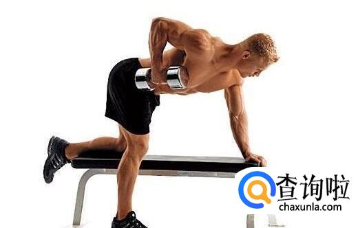 1.俯立,一手撑训练椅,一手屈肘持铃,上臂贴紧体侧,上体与地面平行。