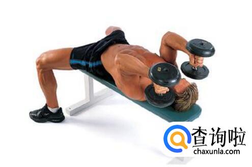 1.仰卧在地面或训练椅上,握住哑铃,在头后方慢慢下降,双手对握。