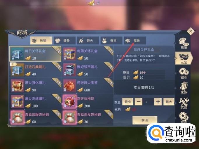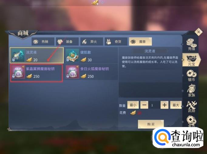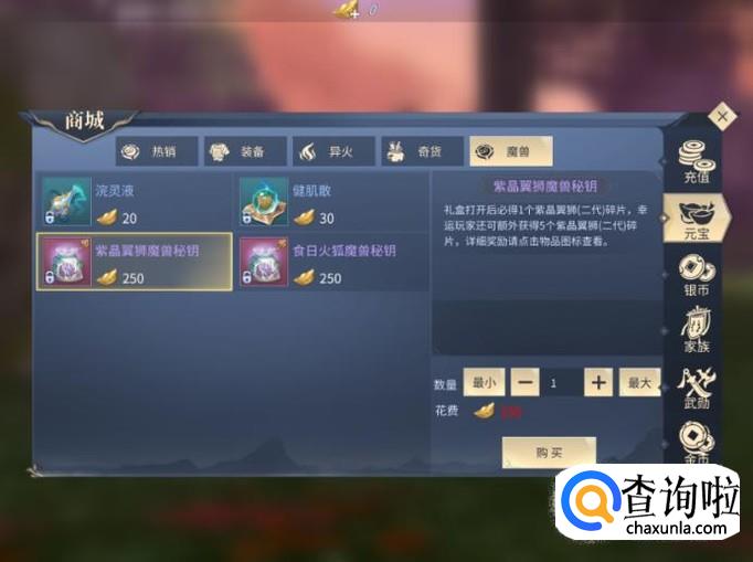 接着花费250元宝购买【紫晶翼狮魔兽密钥】,打开后可以获得紫晶翼狮碎片。只要玩家拥有100个紫晶翼狮碎片,这样就能兑换获得紫晶狮王了。