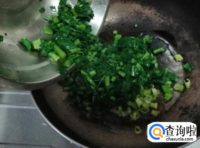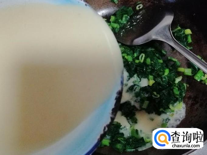 炒锅放油,油热后放入葱花炝锅,炒出香味后,倒入烫好的萝卜叶子,用铲子快速翻炒均匀,然后加入打好的豆浆。