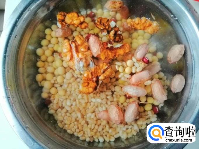 这里我们要准备一个豆浆食材,主要用黄豆一量杯,可以添加三分之一杯麦仁,十来粒花生,两个核桃,所有食材提前两小时泡好,为了更营养也可以加入适量胡萝卜,豆子泡好后,放入全自动豆浆机,加入适量清水,拧好豆浆机盖,插上电源,按打浆工作键,豆浆机二十分钟后,就可以打好营养豆浆。