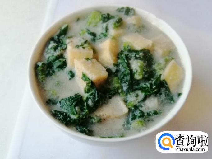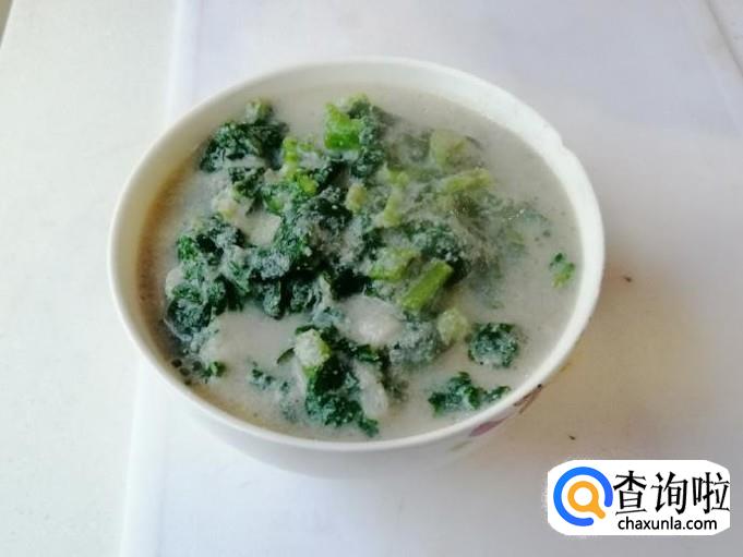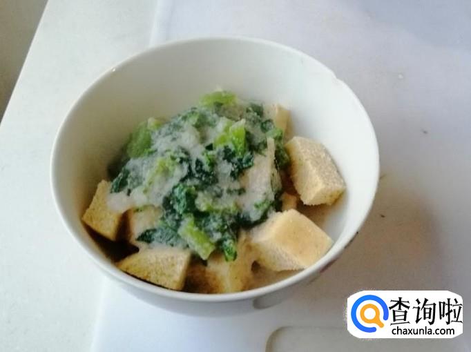 把豆浆和青萝卜叶子煮开后,关火加入少许食盐,这个菜粥有点淡盐味,把切好的粗粮馒头丁拿过来,盛入一勺萝卜叶子豆浆粥,放入粗粮馒头碗中,如图所示,我们的营养菜粥泡粗粮馒头就做好了。