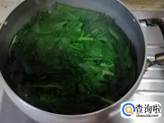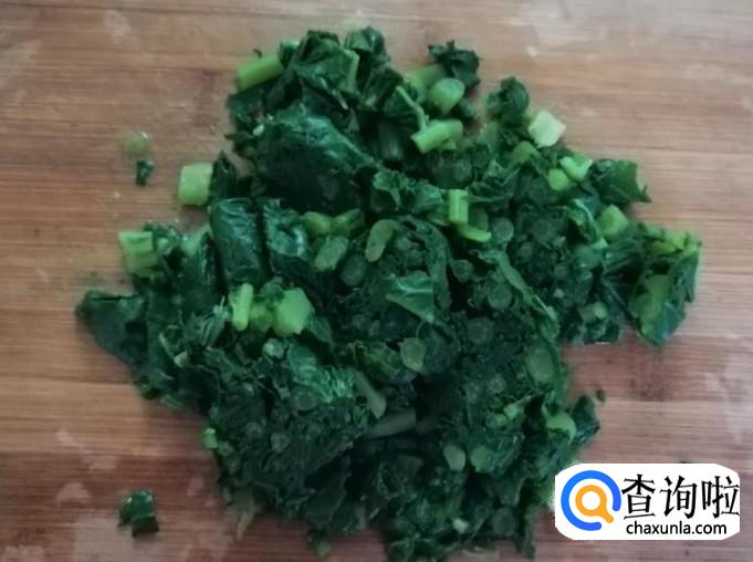 煮锅放水,水烧开后放入备好的青萝卜叶子,烫三分钟左右,把烫好的青萝卜叶子捞出,放凉后切碎待用。