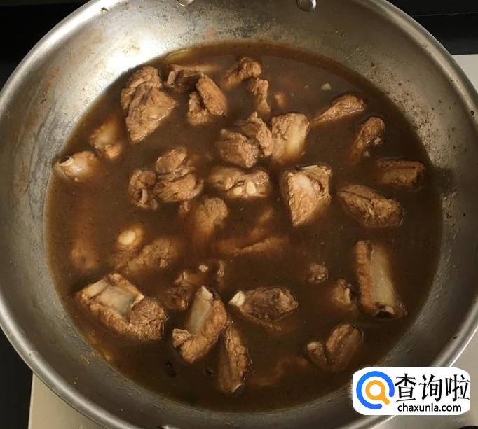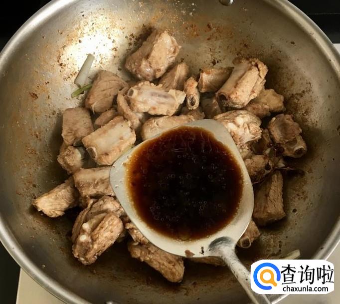 然后加入一点点白糖,烹入料酒、生抽、香醋翻炒均匀使排骨均匀上色