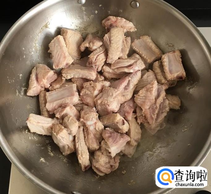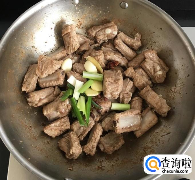 热锅加入适量的花生油倒入泡好并沥干水分的排骨翻炒至没有水分,加入葱段、姜片、蒜片、八角、花椒炒香