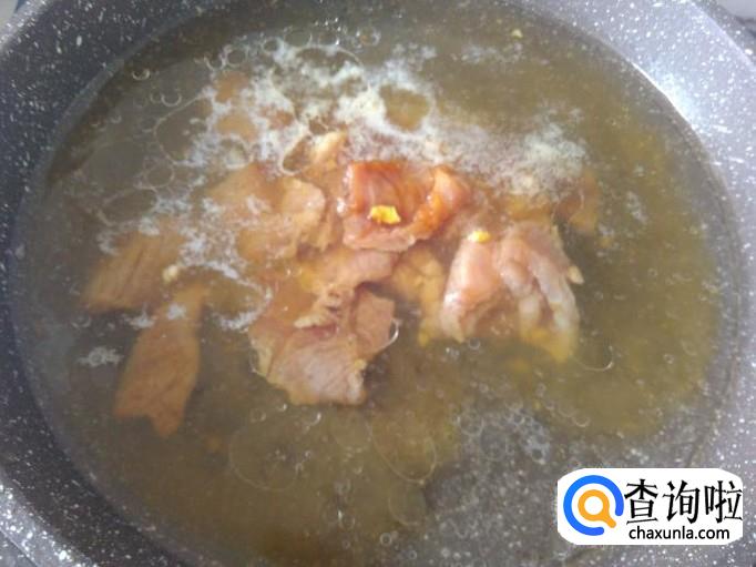 然后放腌好的肉片下去。