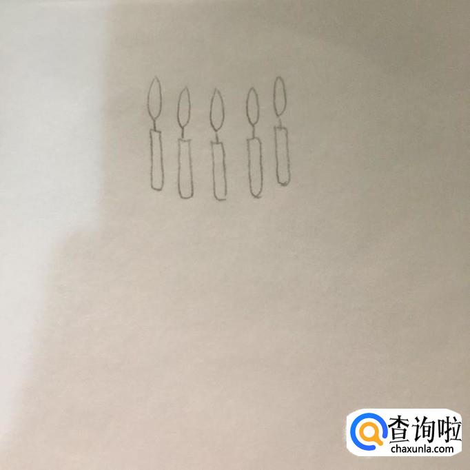 首先在A4纸上画出生日蛋糕的蜡烛,如下图所示。画蜡烛的火苗的时候可以画成一个水滴的形状。接着再画出细条钻的长方形作为蜡烛的主体就可以了。
