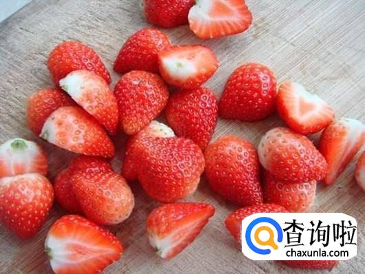 首先把草莓的叶子摘去,然后用清水冲洗干净,沥干水分,然后对切备用