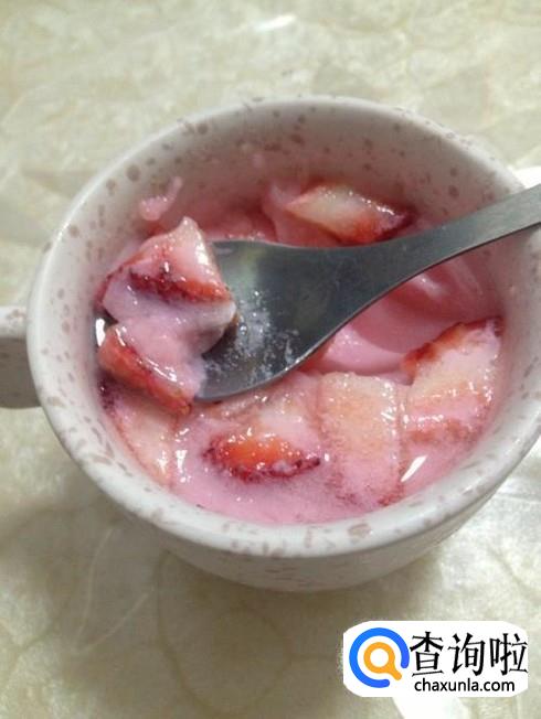 然后把切好的草莓倒入溶液中,用勺子搅拌均匀,使草莓块散开,最后装入干净的布丁瓶中,放入冰箱保鲜层冷却至凝固即可