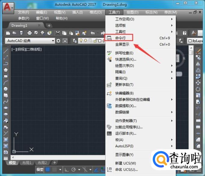 点击工具菜单在工具菜单里的子级菜单哪里找到命令行选项,如图所示: