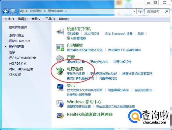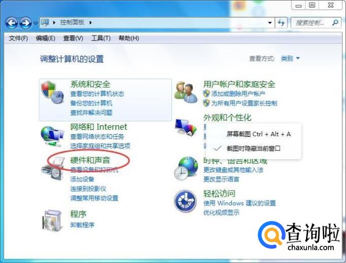打开控制面板,然后点击【硬件和声音】,如下图所示: