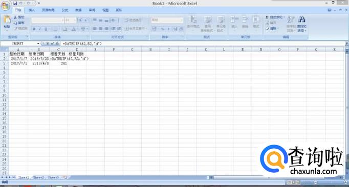 计算相差天数,在C2单元格输入“=DATEDIF(A2,B2,"d")”下拉即可使整个C列都使用这个函数。