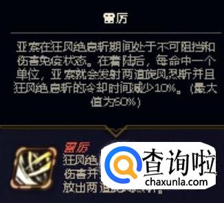 雷厉可以用来增幅亚索的大招,当亚索放出大招时使其免受敌人的伤害,而大招击中对方后,还有额外的伤害。