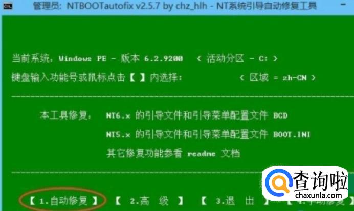 打开系统引导修复工具后,我们可以根据自己的需求选择相应的操作,这里我们以自动修复为例,首先在我们的键盘输入功能号“1”,或者直接鼠标点击【自动修复】。