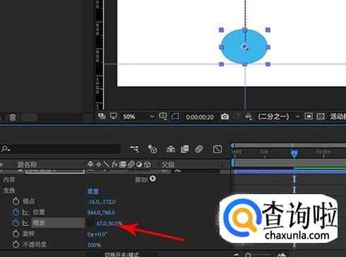 接着将进度移动到20f的位置,这个时候圆的大小肯定有变化,移动到下方自动添加位置关键帧,然后手动调整添加缩放关键帧。