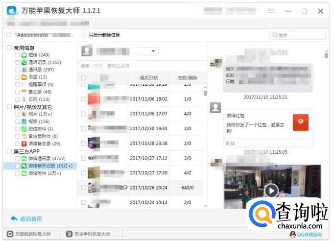 如若想要恢复微信聊天记录,除了recover最实用的方法是用数据恢复软件去恢复,连接手机到电脑上,运行软件,选择【微信聊天记录】,点击开始扫描。并对扫描出来的结果恢复。