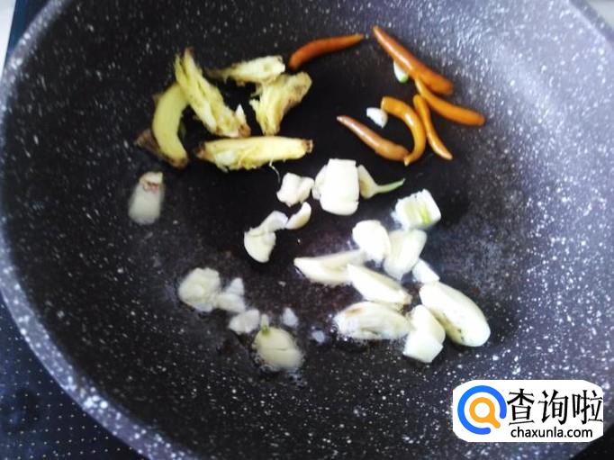 开火下油,放蒜米、泡椒、老姜进去爆香。
