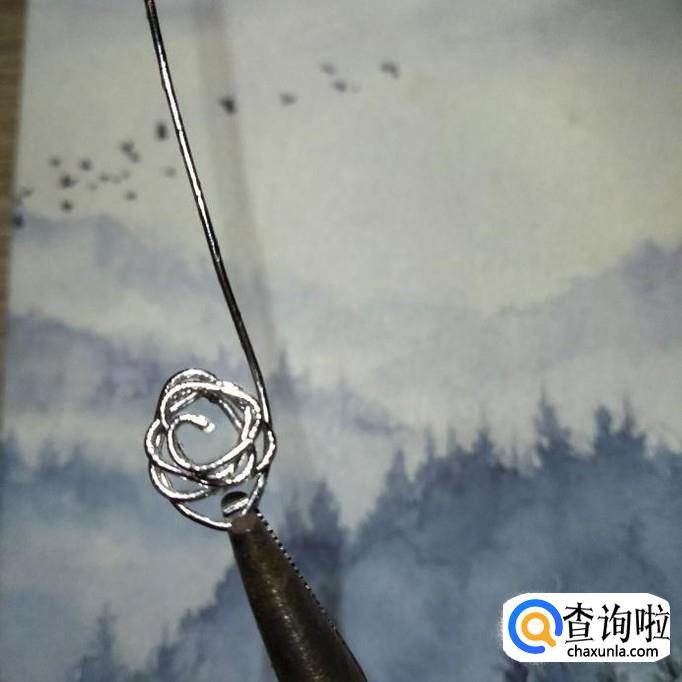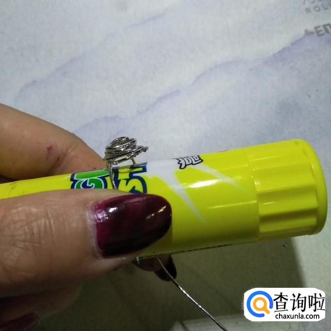 然后我们将剩余的细铁丝抵着戒指的花饰套在一根胶棒上,如下图所示(也可以用笔,根据自己的手指情况来选择工具吧),末端用钢丝钳固定好,然后剪下多余的铁丝
