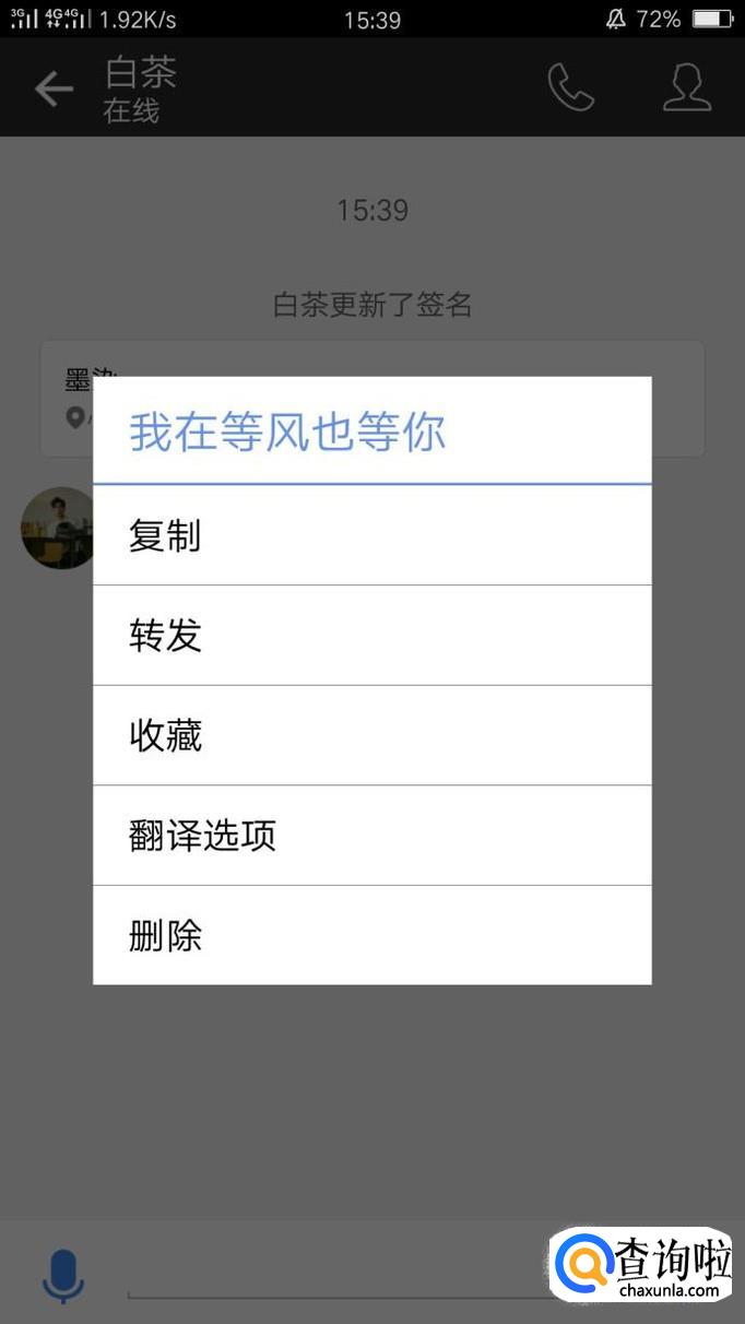 随机点开一消息,长按消息内容,就会出现多个选择,点击第四个“翻译选项”