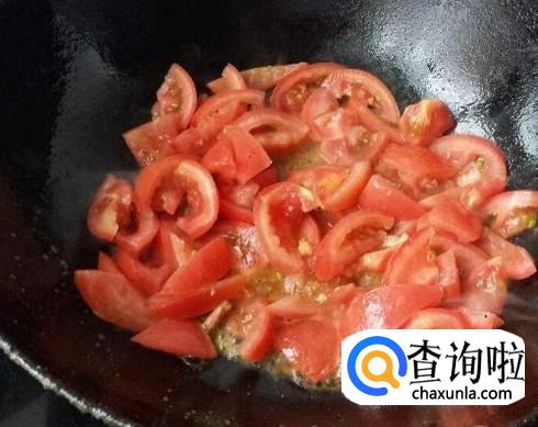 将西红柿块倒入锅中,翻炒均匀,倒的时候,要慢慢倒,或者用锅盖盖上,以防油溅出来。