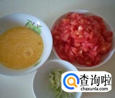 将西红柿去掉皮,切成小块,将鸡蛋打入碗中,将葱切成末。