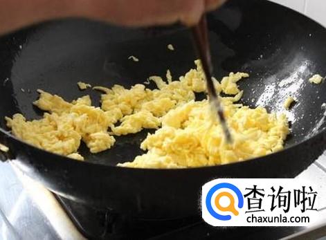 先在锅中放入食用油,烧热后,放入鸡蛋液,同时用筷子搅成均匀的小块,炒熟后,盛入盘中。