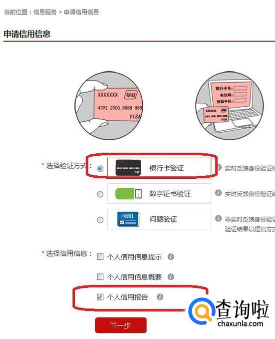 登录后,我们就可以选择需要的信用信息了,如图所示,我们勾选“个人信用报告”。不过要生成报告,我们需要验证下身份,我们点击选择“银行卡验证”,然后点击下一步,进入验证。