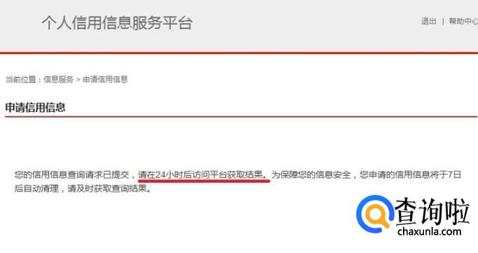填完之后,我们还需要等待24小时才可以,因为系统需要审核,如果信息填写都正确的话,24小时后,我们就可以再次登录征信中心,打印个人信用报告了。