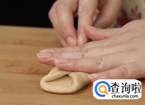 松弛好的面团擀成椭圆形,用手拍掉气泡,翻面,两边向中间内折拍紧。继续中间内折,捏紧收口,放油纸上温暖处醒发30min。