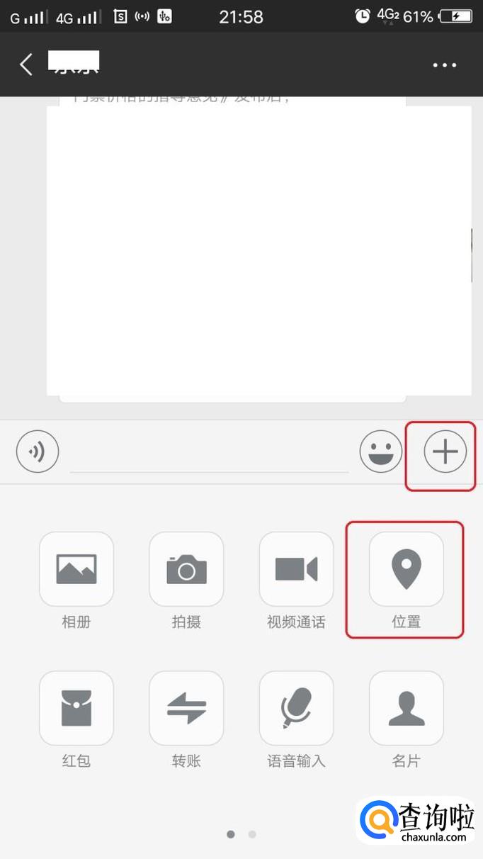打开微信与朋友聊天界面,如图所示,点击图中“+”,就可以看到“位置”,我们点击一下。