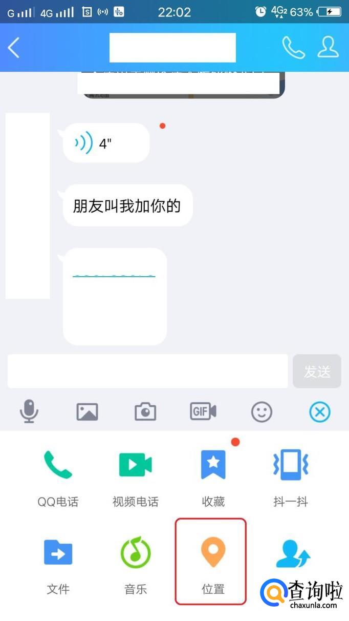QQ定位也是一样的道理,点击与朋友聊天,也是点击右下角“+”,就可以看到“位置”,之后方法就与微信一样了。