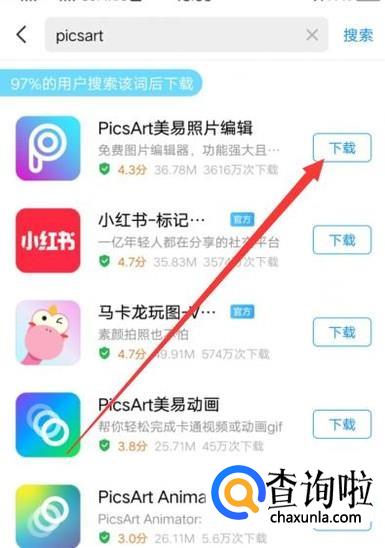 进入之后,搜索“picsart”,将图示软件下载并安装。