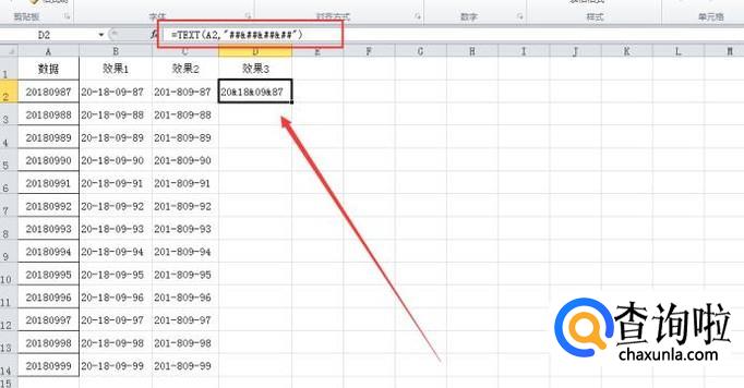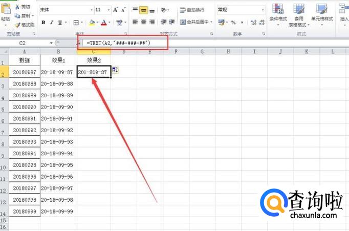 除了这种相同个数数值之间加横杠,我们还可以根据需要变换,例如变成3个数字一个横杠,或两个数字一个横杠,即文中开头的“效果2”,同样的鼠标单击在“C2”单元格中,输入公式:=TEXT(A2,"###-###-##"),然后按“enter”键确认,如图所示。