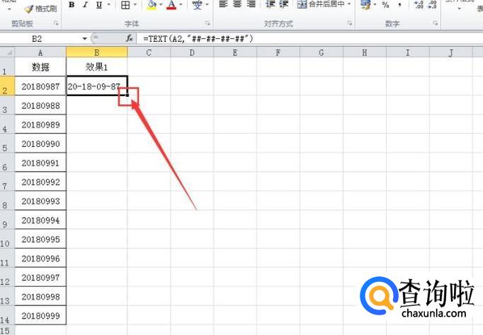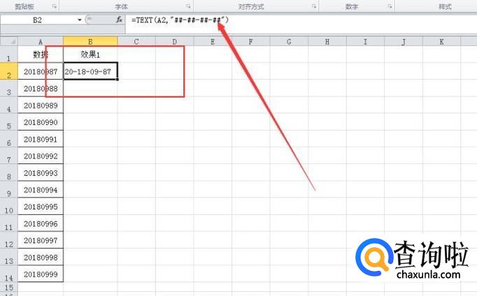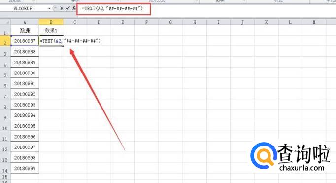 鼠标单击在B2单元格的时候,我们输入公式:=TEXT(A2,"##-##-##-##"),然后按“enter”键确认即可。