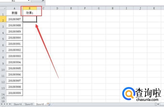 然后,我们在B1单元格中输入文字“效果1”,方便区分,为了对应上A1列的数据,然后我们需要单击B2单元格,如图所示。