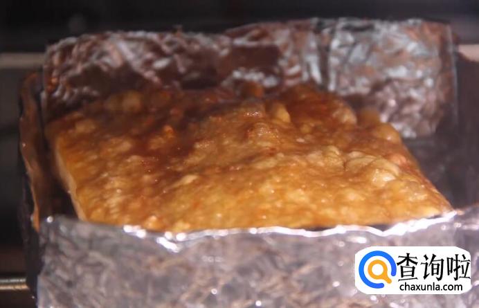 用锡纸做一个小碗,放入腌制好的猪肉,烤箱上下火230度,烤40分钟。