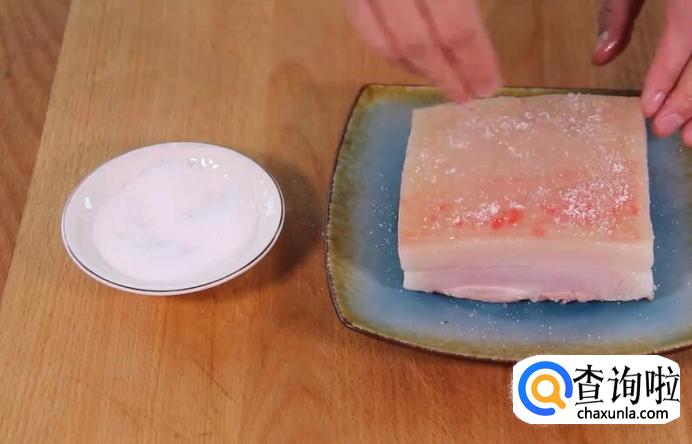 猪肉表面均匀的抹上一层盐,放冰箱腌制一夜。