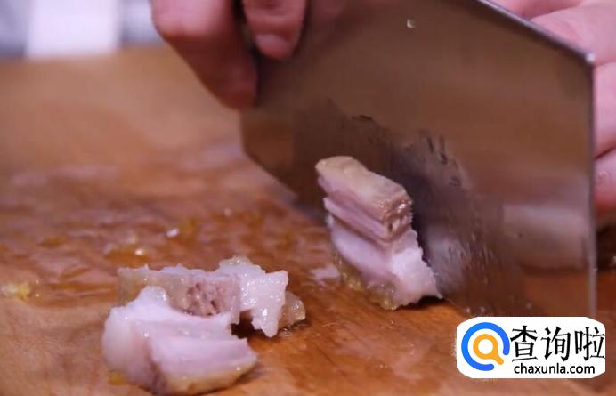 猪皮烤至金黄色放凉取出,切块。