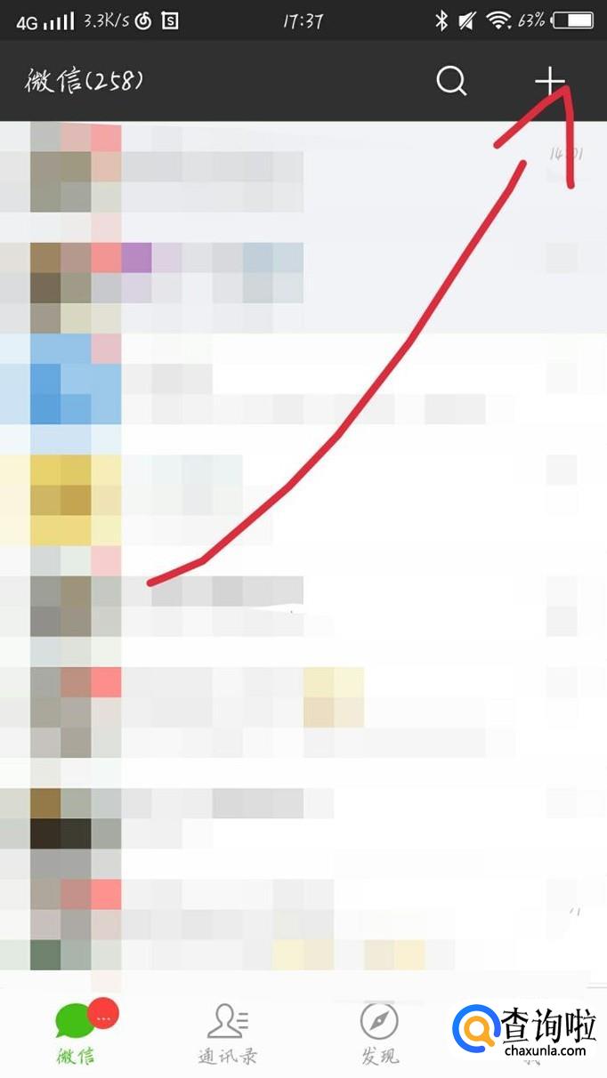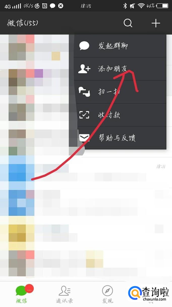 点击右上角的“+”选项,如图1箭头所示。你会看到出现一个新的界面,点击“添加朋友”选项,如图2箭头所示。