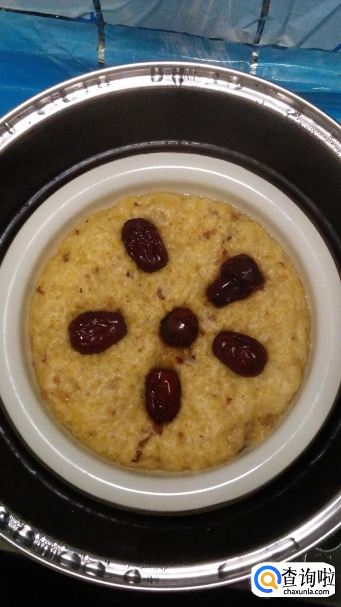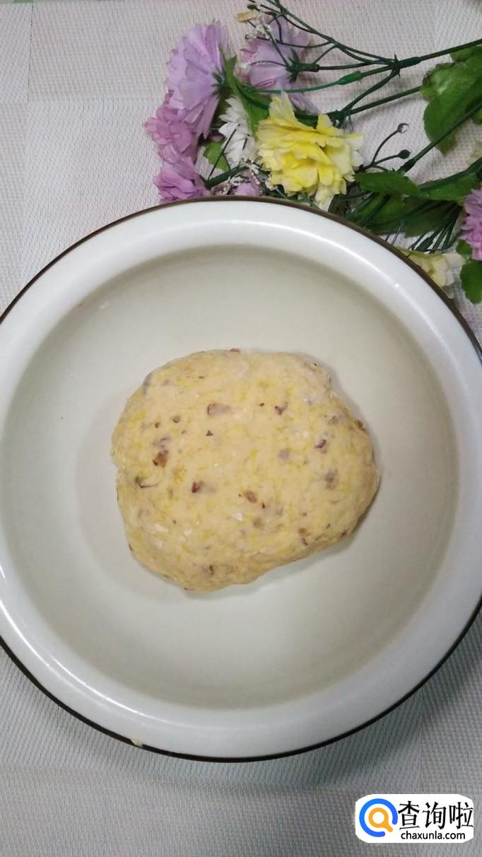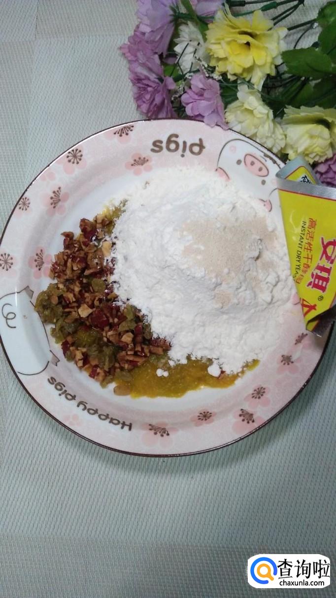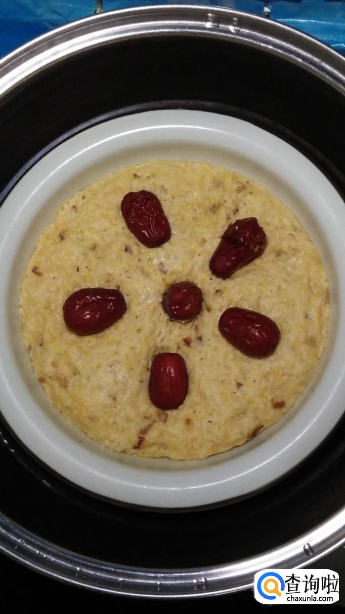 加入适量温水和成面团,放温暖处,醒发至两倍大,然后将泡好的大枣,按在上面。注意,可以在容器上抹上一层油,这样做好的发糕很容易就拿出来了。