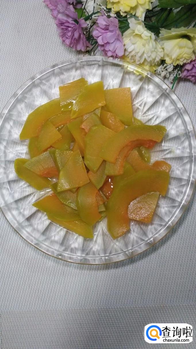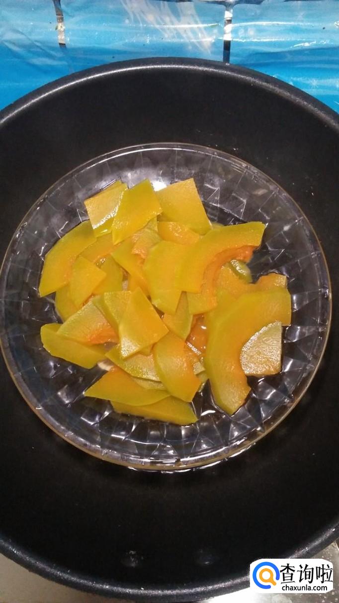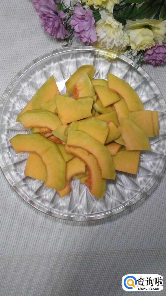 将南瓜去皮,切成片,然后上蒸锅蒸一下,蒸至软烂就可以了。注意,尽量将南瓜切薄一些,这样更容易蒸熟。