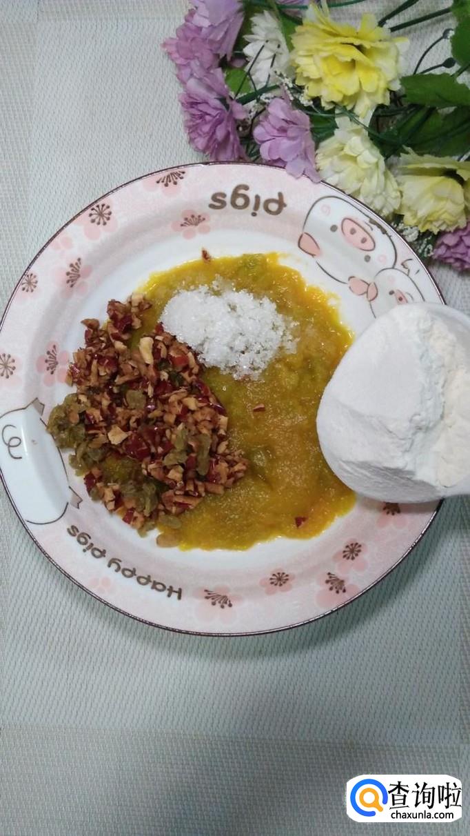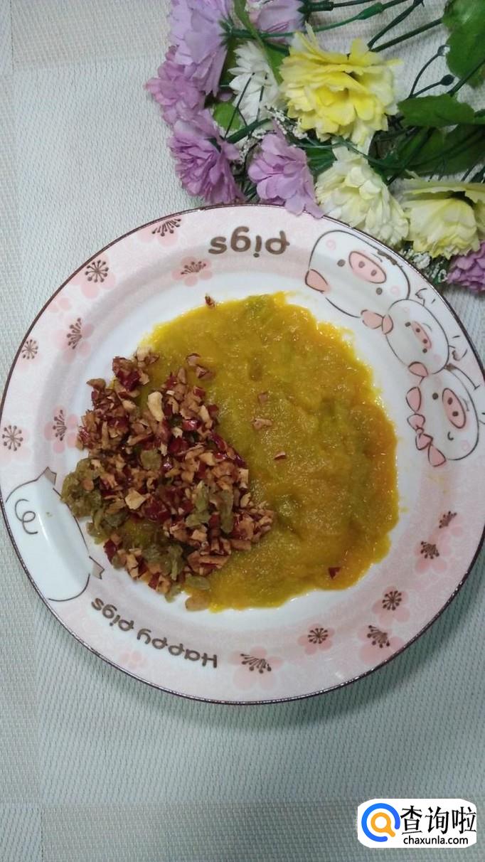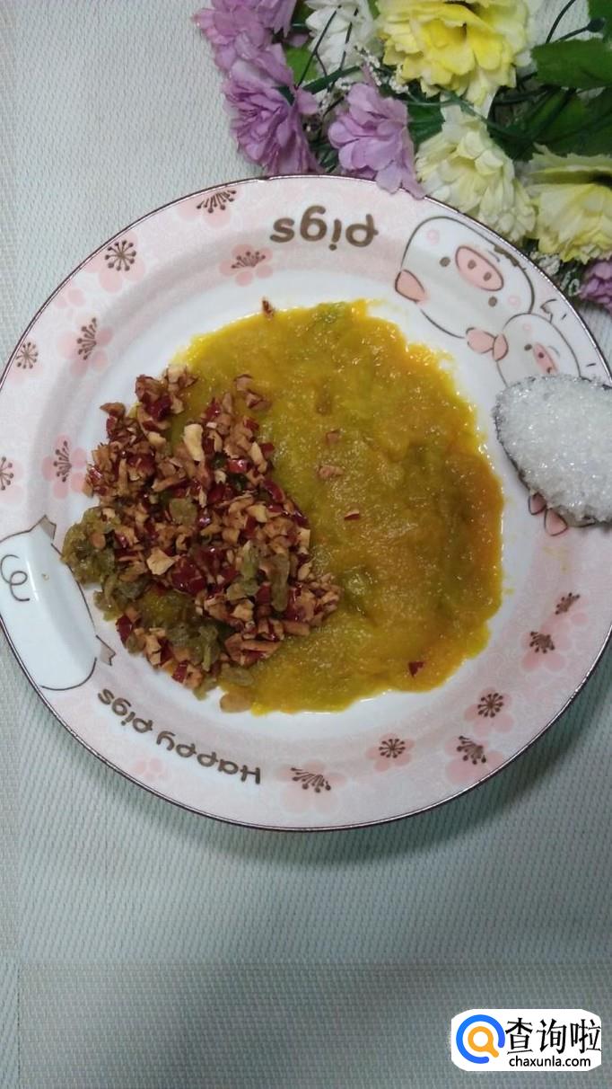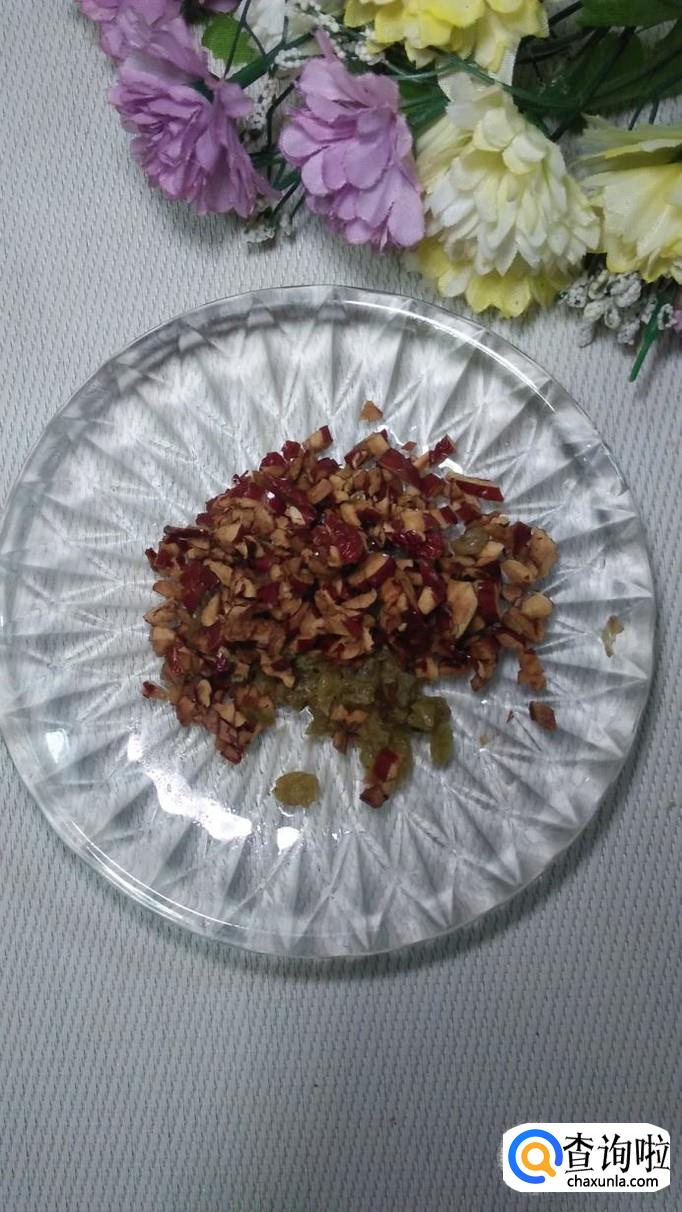 将南瓜用勺子压成泥,将泡好的大枣去核切碎,葡萄干儿也切碎,然后将三者放在一起放入盘中备用。