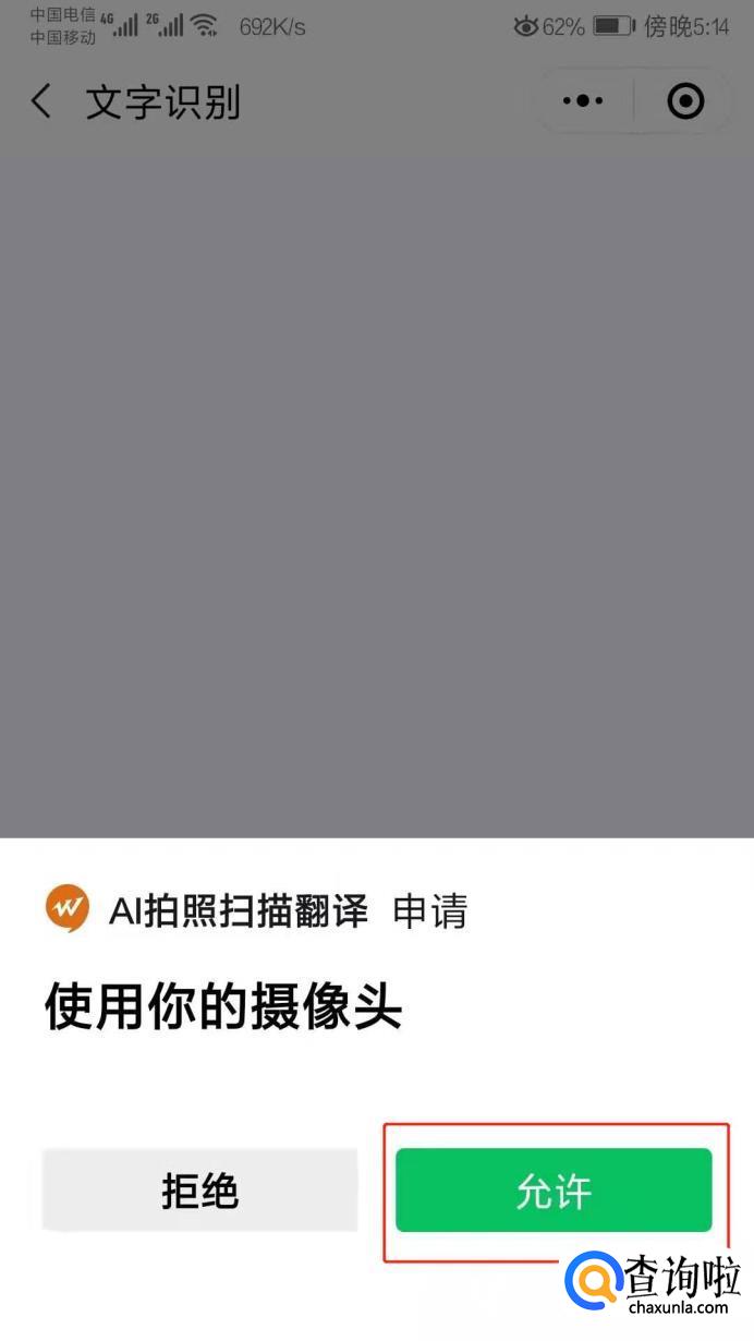 先来试一试第一个文字扫描,点击文字扫描功能,会弹出如下对话框,点击允许。