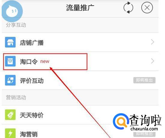 进入“流量推广”界面,在找到“淘口令”。