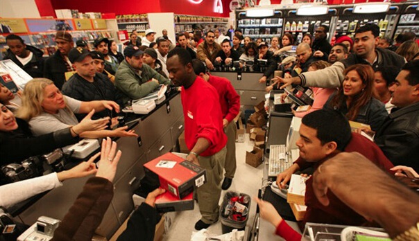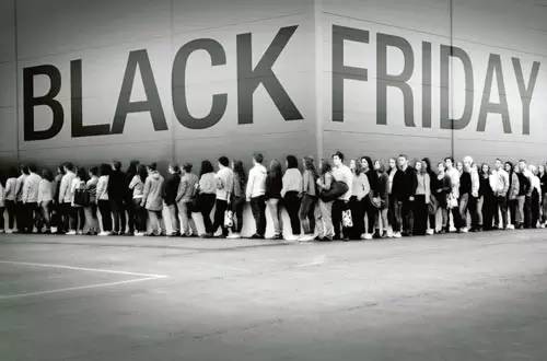 关于“黑色星期五”的由来有多种说法,其中一种就是指黑压压的一片人在感恩节后的星期五去商场排长队购物。