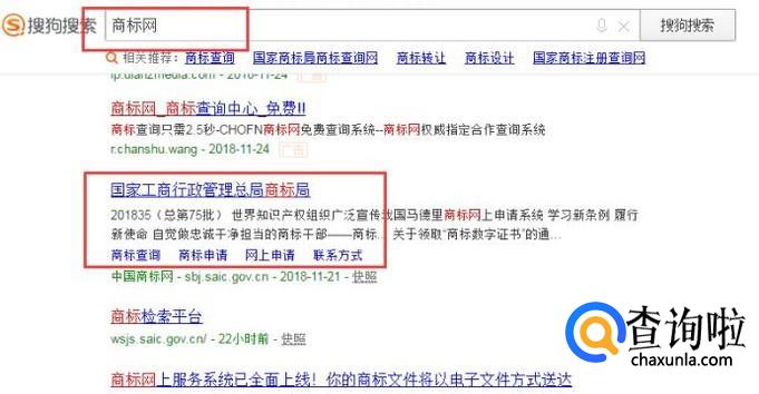 在浏览器中输入【商标网】,点击链接进入商标网,如下图所示: